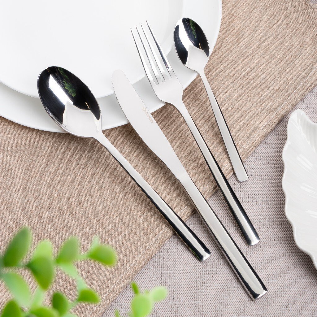 Набор столовых приборов Daniks Verona — это продуманное сочетание функциональности и современного стиля. В комплекте 24 предмета из нержавеющей стали: ложки, вилки, ножи и чайные ложки для 6 человек. Серебристый цвет гармонирует с любой сервировкой, а металлические ручки обеспечивают удобство в использовании. Для тех, кто ищет, какой набор столовых приборов лучше выбрать для дома или подарка, этот вариант оптимален по соотношению цены и качества.