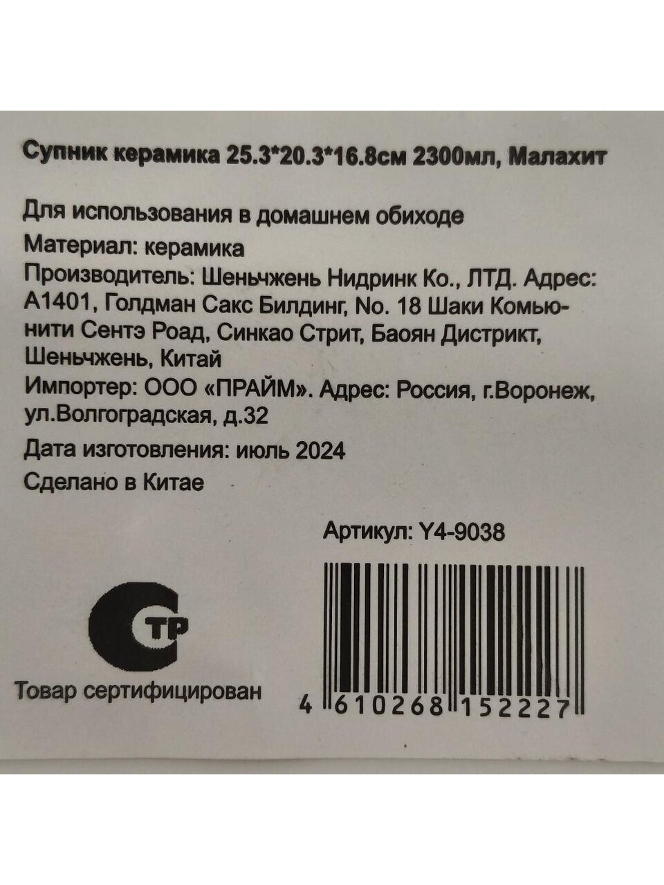 Вы можете приобрести «Супник керамика, 2.3 л, 25.3х20.3х16.8 см, Малахит, Y4-9038» и другие товары в нашем интернет-магазине в Армавире по низким ценам и с бесплатным самовывозом.