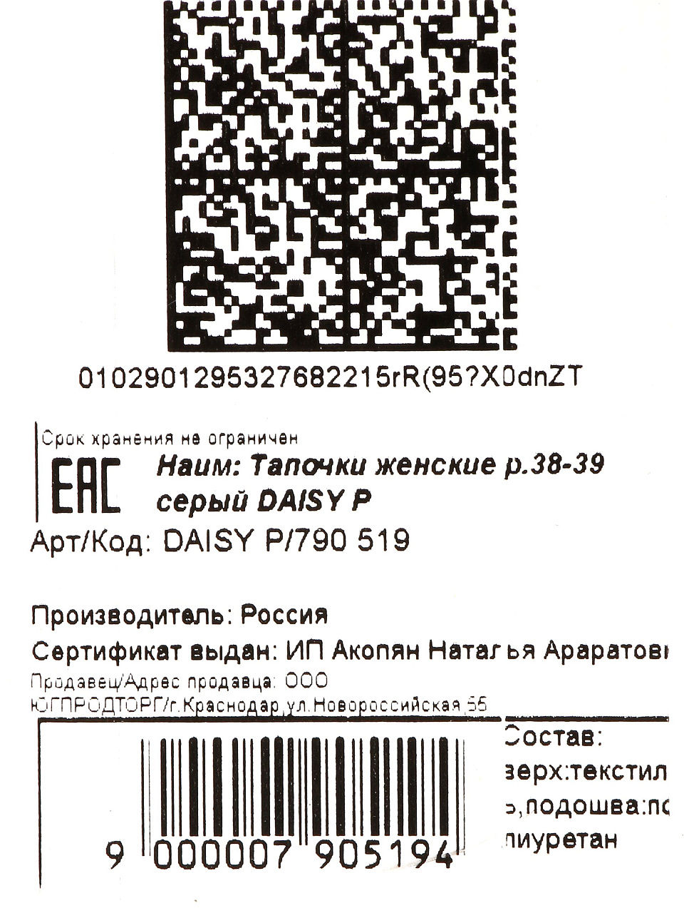 Тапки DAISY Р идут в размере 38-39, рассчитаны на стандартную женскую стопу. Если носите половинчатый размер, рекомендуем ориентироваться на больший.