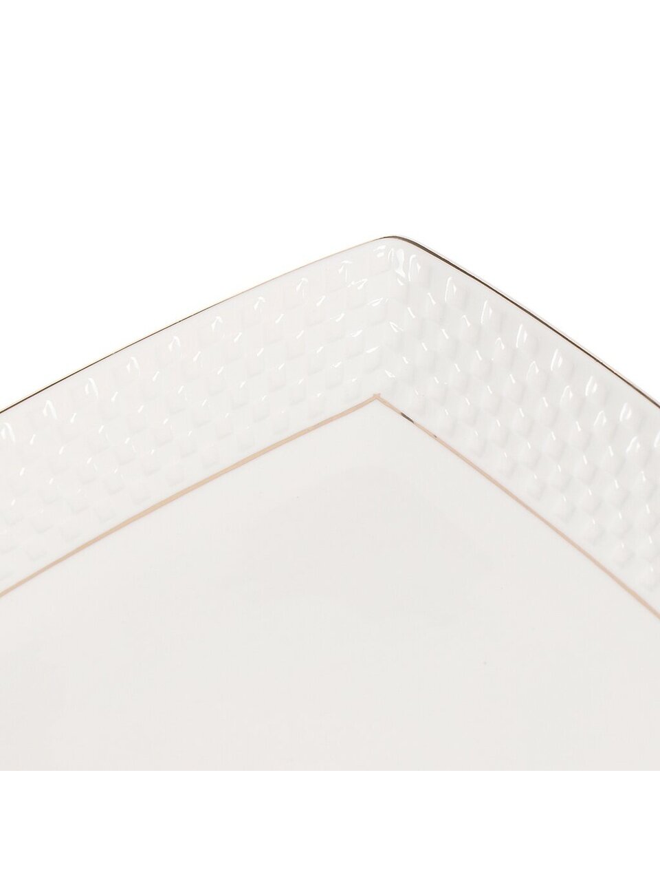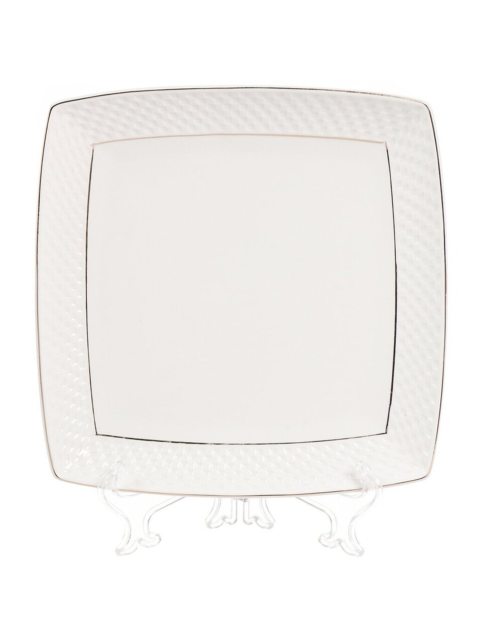 Тарелка квадратная, диаметр по краям — 23 см, выполнена из прочной керамики с золотой каймой, без рисунка и в однотонном белом цвете.