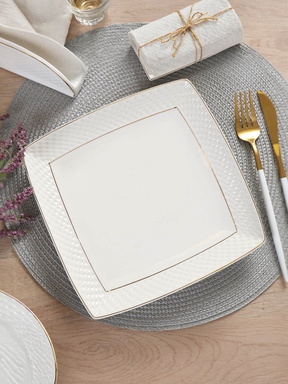 - Эффектный дизайн: современная квадратная форма и золотая кайма выделяют сервировку и подчёркивают вкус хозяев