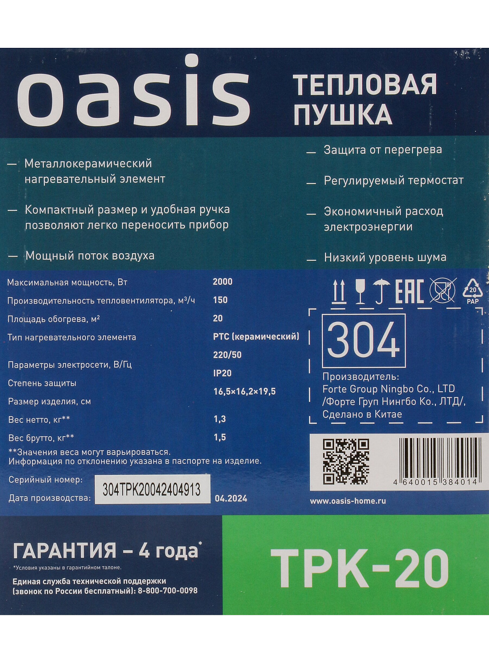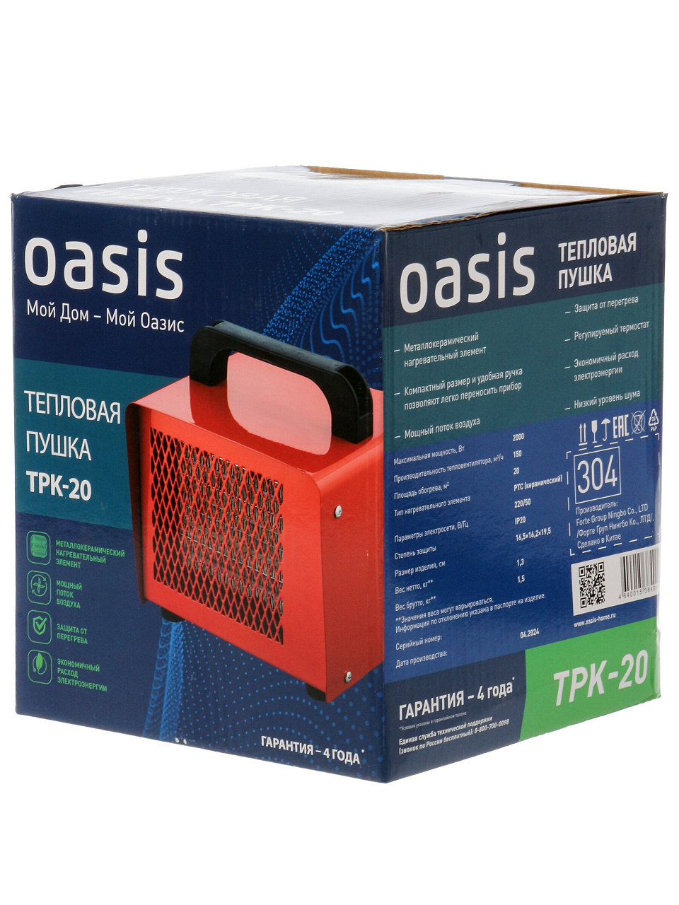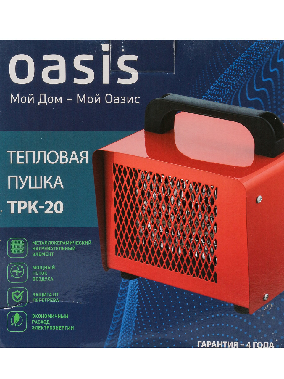 Oasis TPK-20 — электрическая тепловая пушка 2 кВт: быстрое и безопасное отопление до 20 м², мобильная, керамический ТЭН, 36 мес. гарантии.