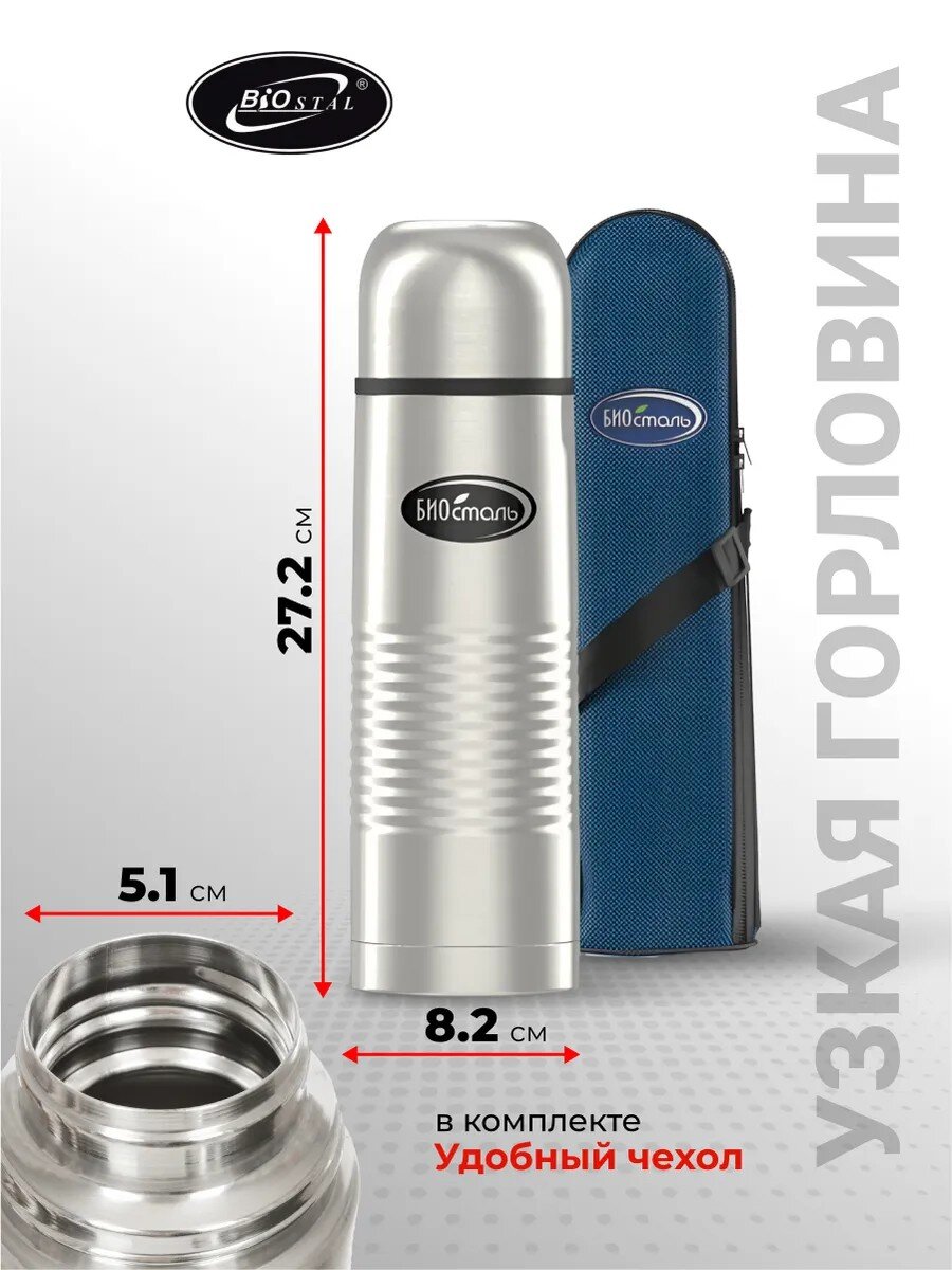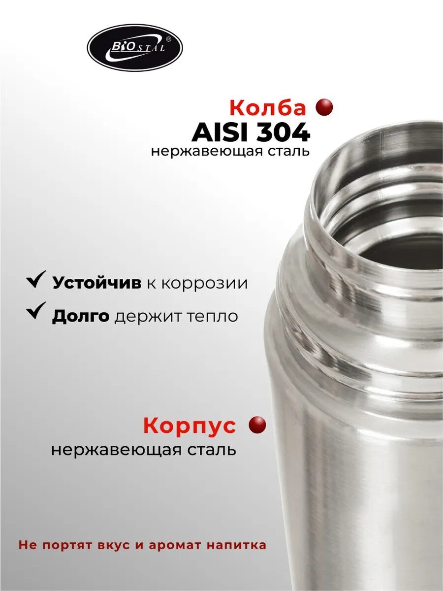 Если вы ищете, какой термос лучше выбрать для чая или кофе, обратите внимание на герметичную навинчивающуюся крышку и ударопрочный корпус: Biostal выдерживает активное использование и не протекает в рюкзаке. В отличие от аналогов с пластиковой колбой, эта модель полностью выполнена из стали, что исключает появление запахов и гарантирует сохранность вкуса напитков. Чехол с ремешком облегчает переноску, а серебристый цвет делает модель универсальной для мужчин и женщин. Подходит ли такой термос для горячих и холодных напитков? Да, благодаря продуманной конструкции он одинаково эффективен для чая, кофе, компота, лимонада и даже холодной воды.
