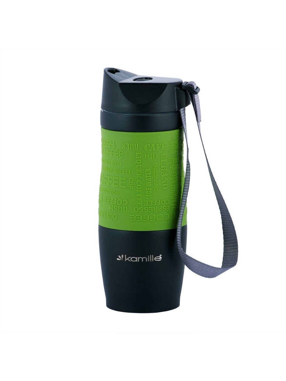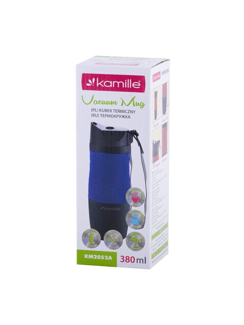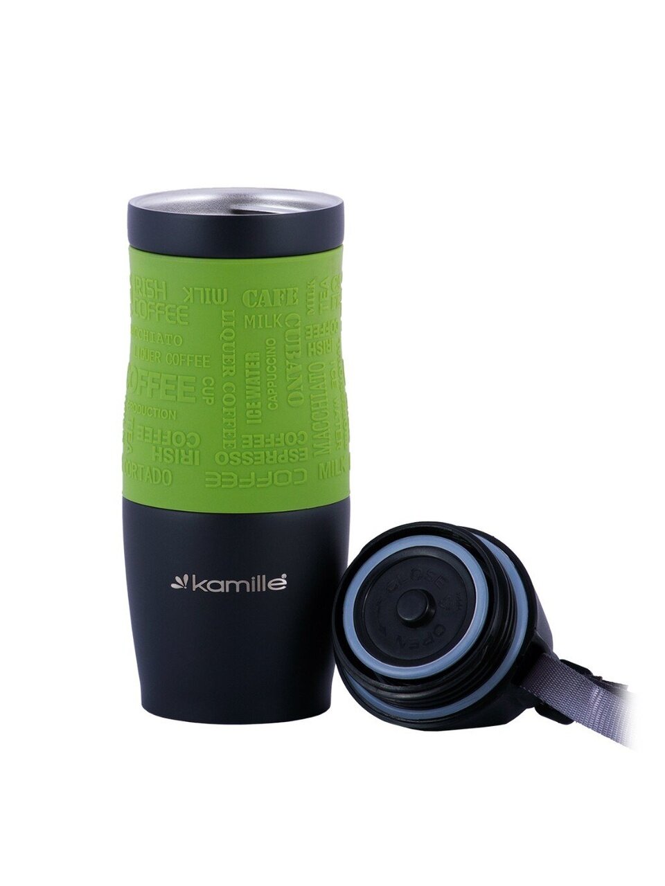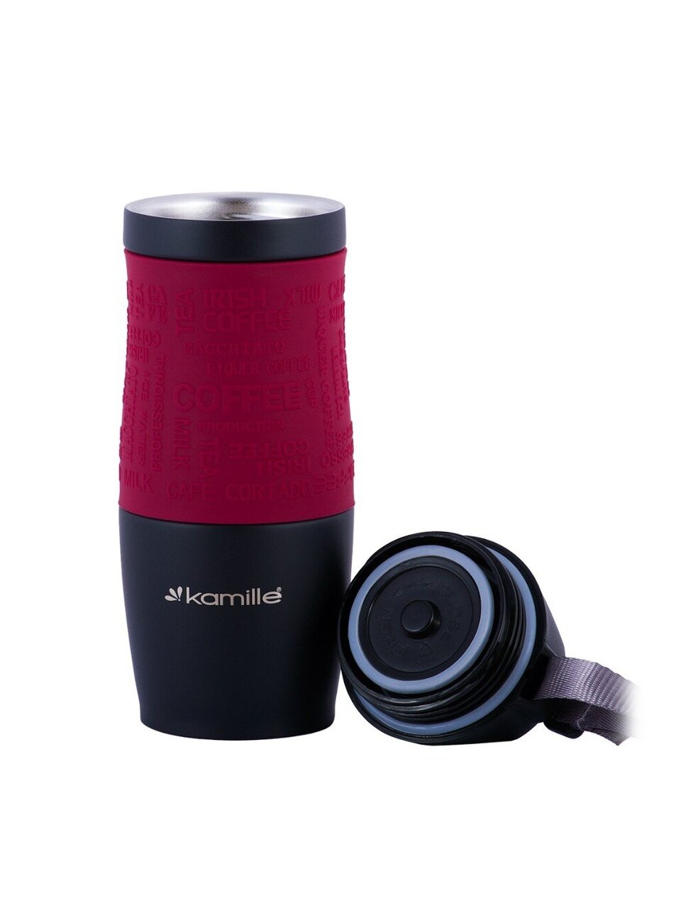 Термокружка Kamille 0.38 л: сохраняет тепло и холод до 24 часов, стальной корпус, удобный ремешок, идеальна для города и похода.