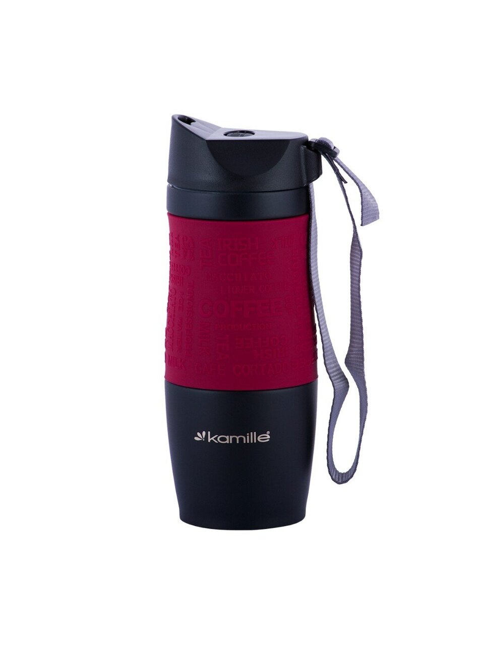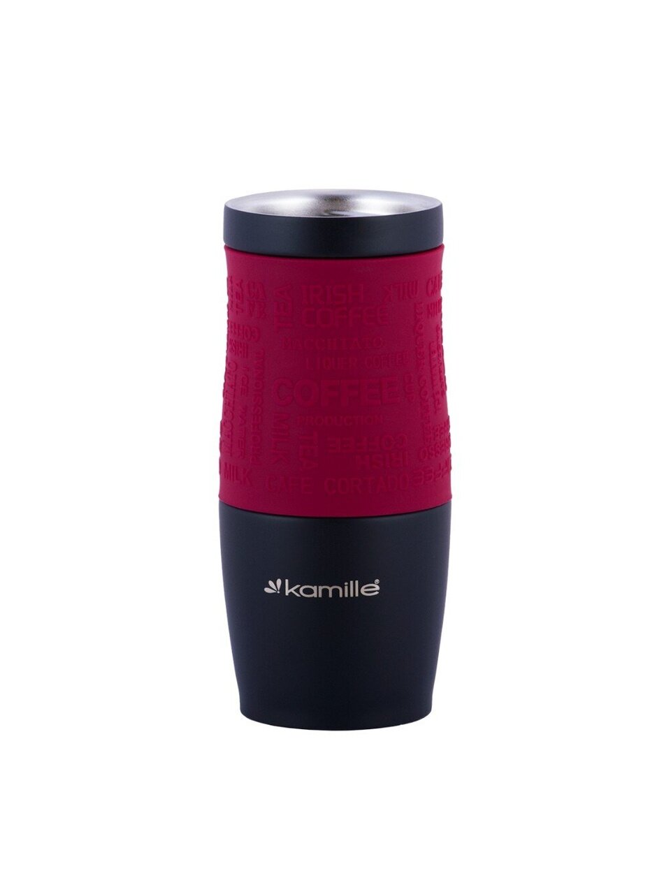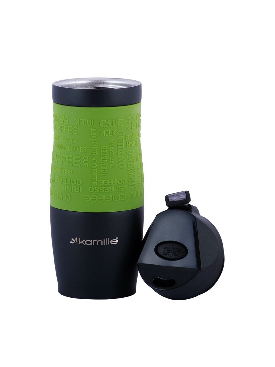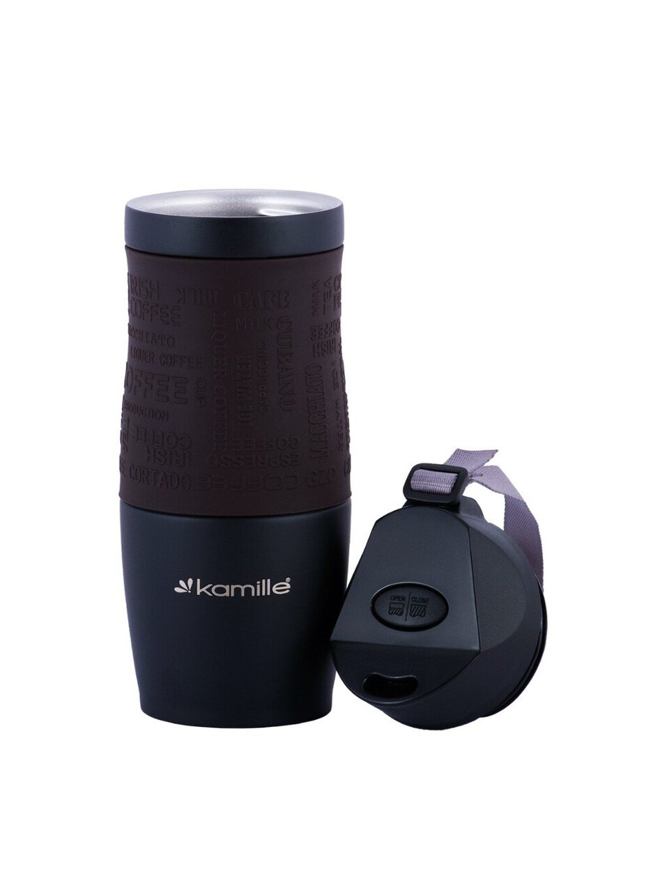 Термокружка Kamille 0.38 л: сохраняет тепло и холод до 24 часов, стальной корпус, удобный ремешок, идеальна для города и похода.