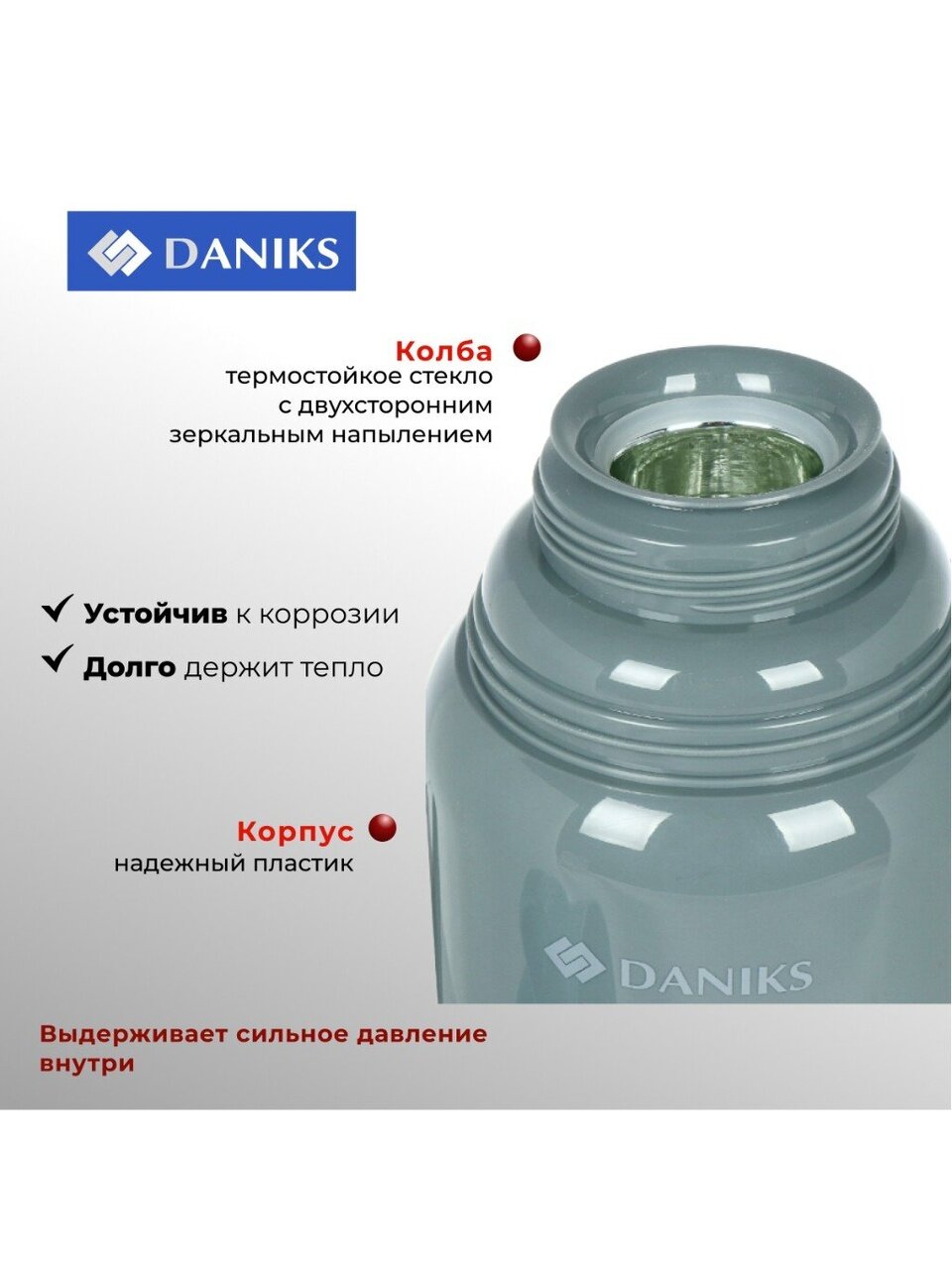 Термос Daniks CA-180 держит температуру напитков — горячих и холодных — до 24 часов благодаря стеклянной колбе и плотной крышке.