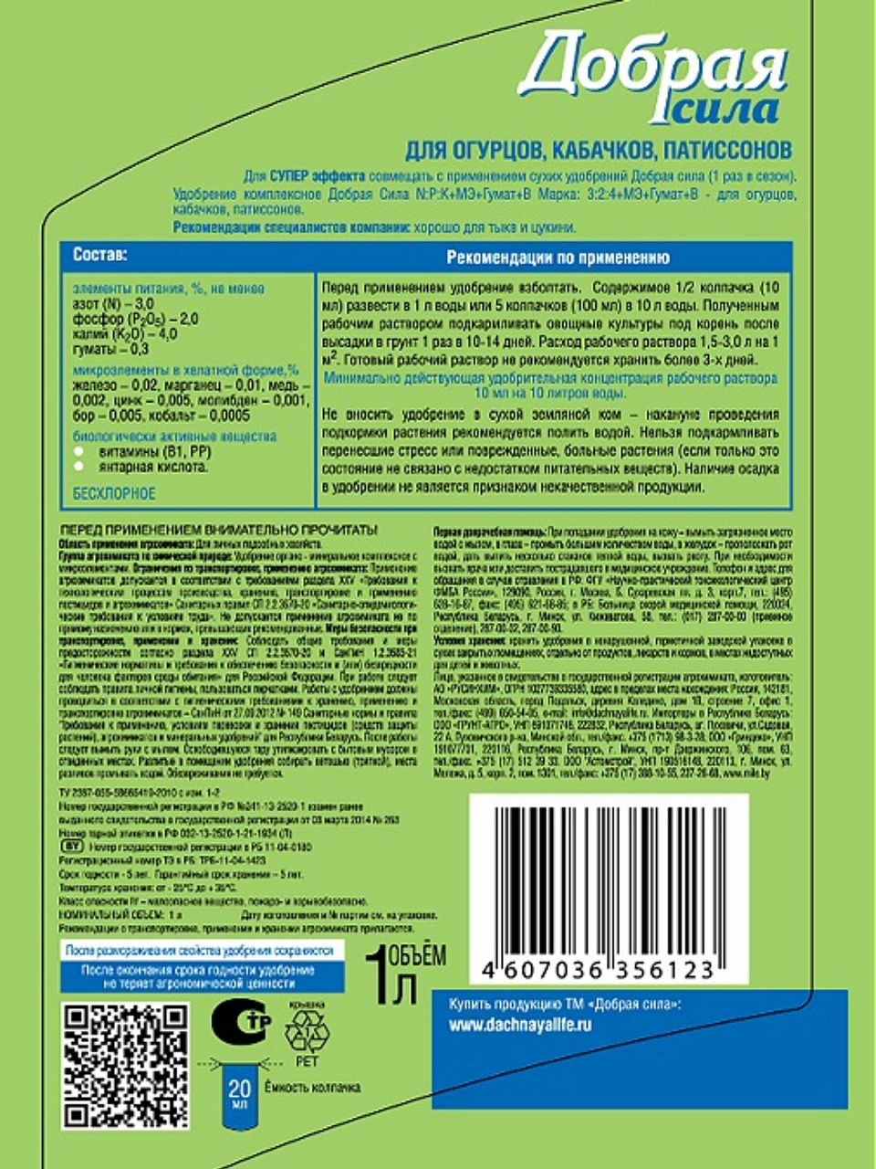 Оформите заказ на удобрение для огурцов, кабачков и патиссонов «Добрая сила» прямо сейчас — получите гарантированно свежий товар и бесплатную консультацию по применению. Покупайте недорого с быстрой доставкой по России!