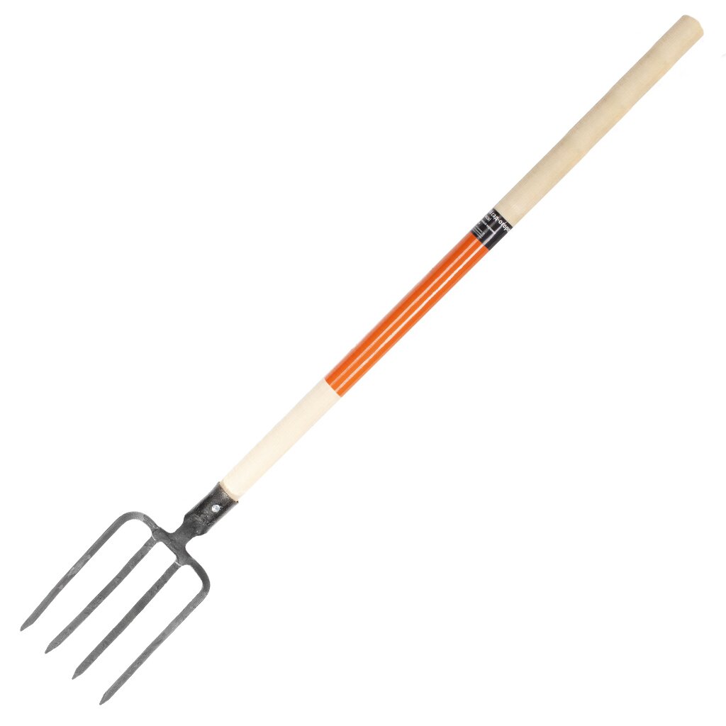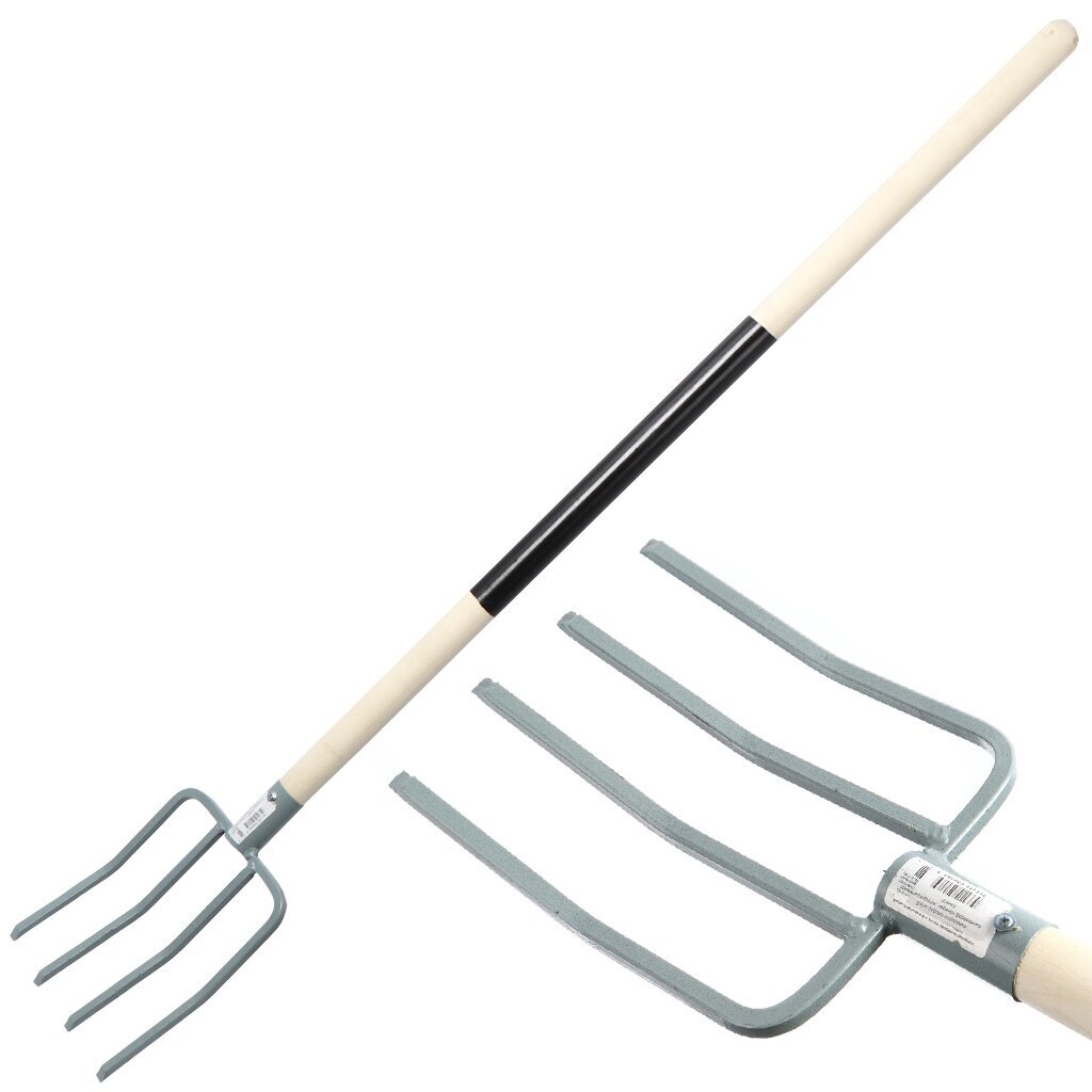 Вилы четырехрогие выполнены из закаленной стали, имеют обработанный черенок из древесины. Заостренные зубцы легко проникают в грунт, снижая нагрузку на ногу.