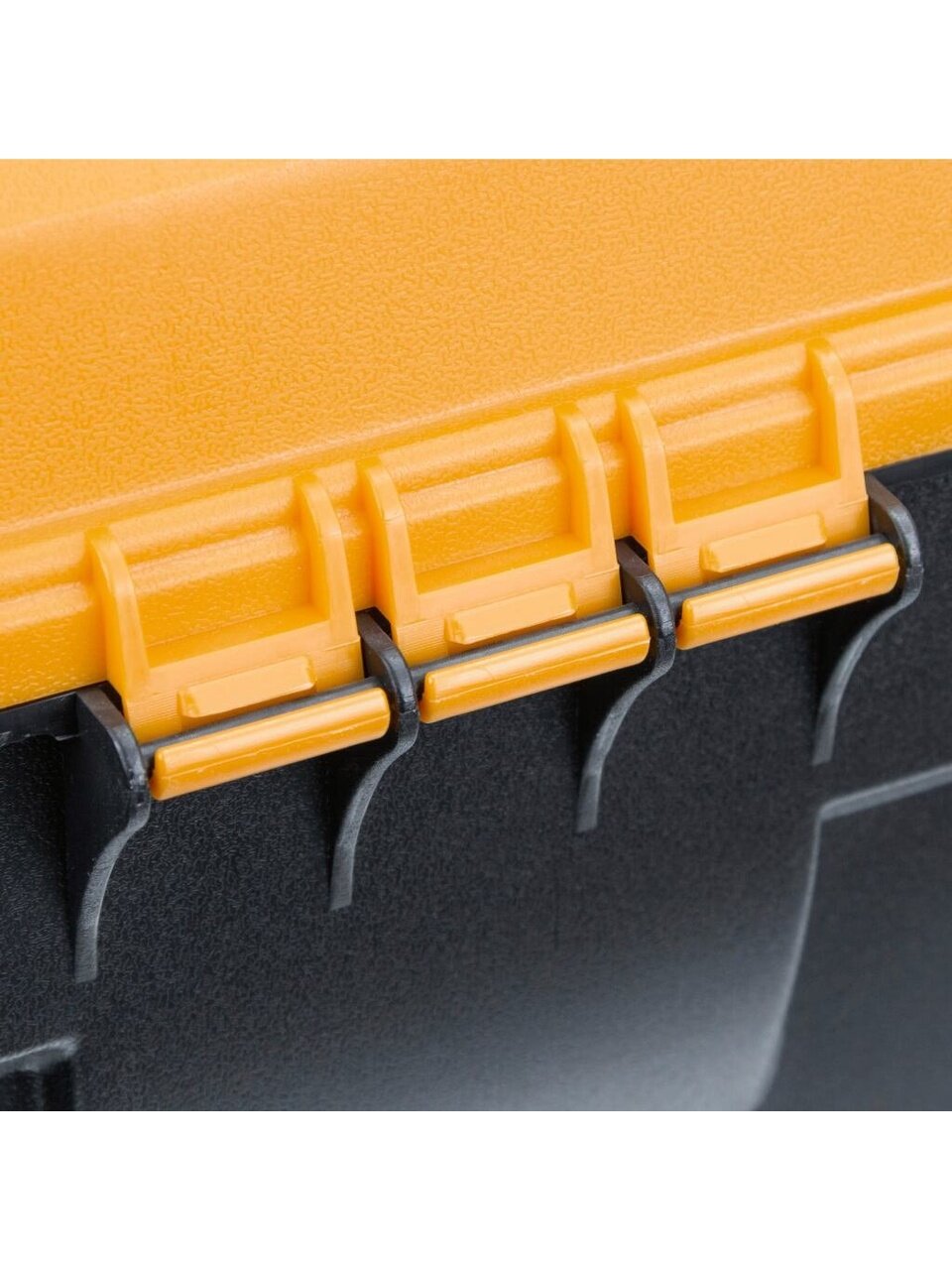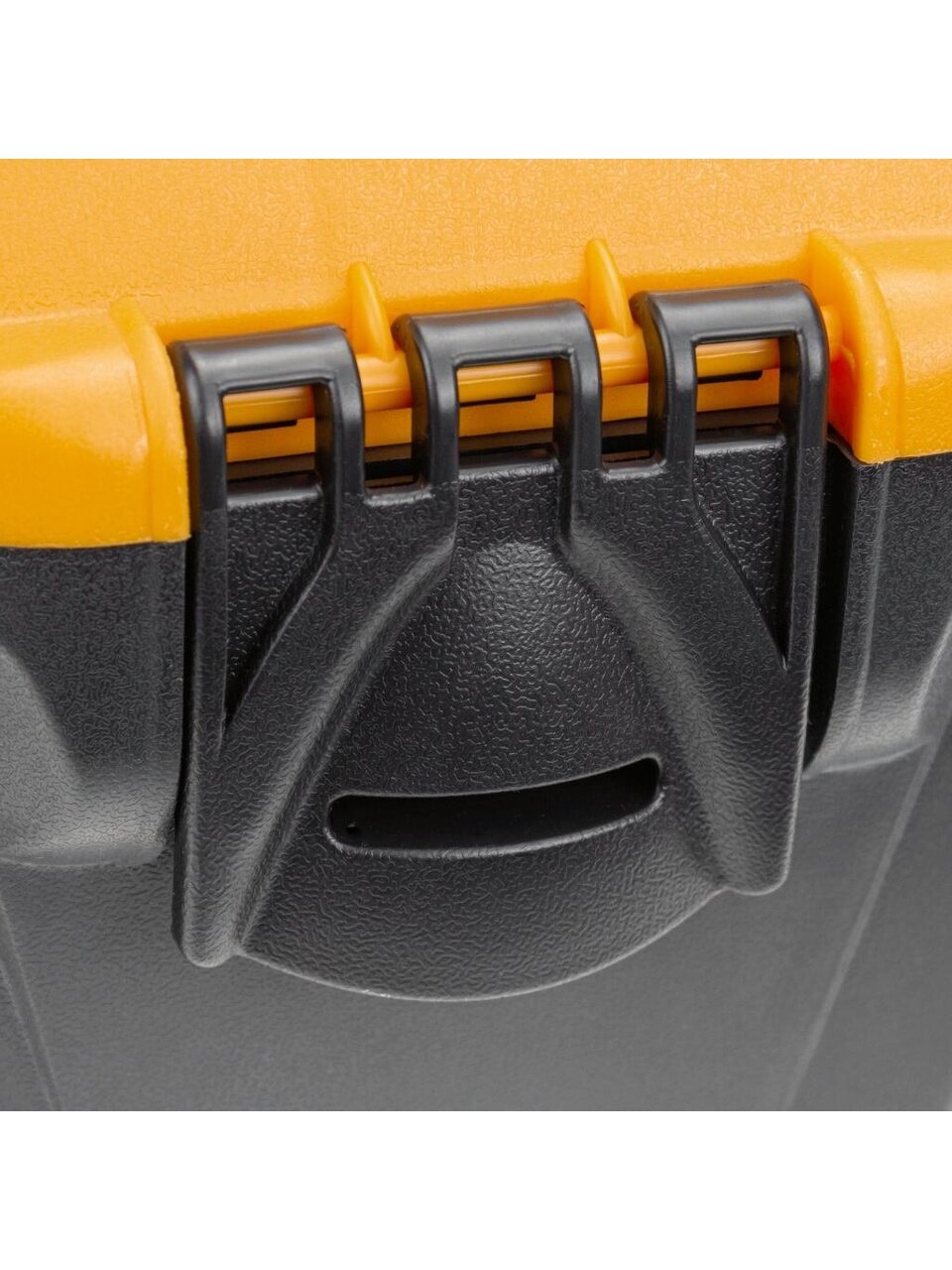 Ящик для инструментов с вкладышем и замками изготовлен из прочного безопасного пластика.